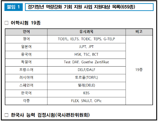 '경기청년 역량강화 기회 지원사업'의 지원 내용은 미취업 청년에게 어학시험 및 자격시험의 응시료를 연 3회 최대 30만원, 회당 최대 10만원으로 지원하는 것입니다. 청년 1인 지원 합산금액이 10만원까지는 횟수 제한이 없습니다. 응시료를 지원하는 어학/자격 시험은 어학 19종, 국가기술자격, 국가공인 민간자격에 해당됩니다.