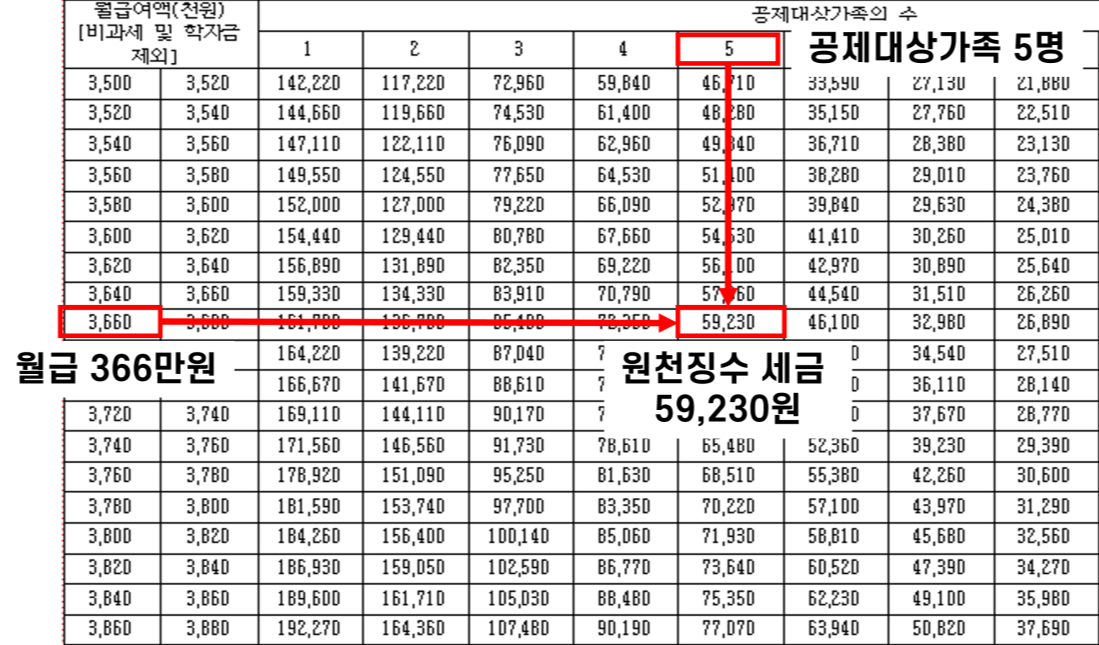 - 간이세액표 참조: 월 급여 3,000,000원, 공제대상가족 6명 기준