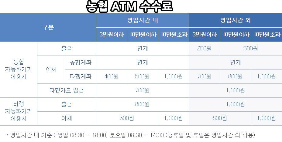 A: 농협은행 고객이 농협 ATM을 이용할 때는 대부분 무료입니다. 하지만 타행 ATM 이용이나 영업시간 외 이용 시 수수료가 발생할 수 있습니다.