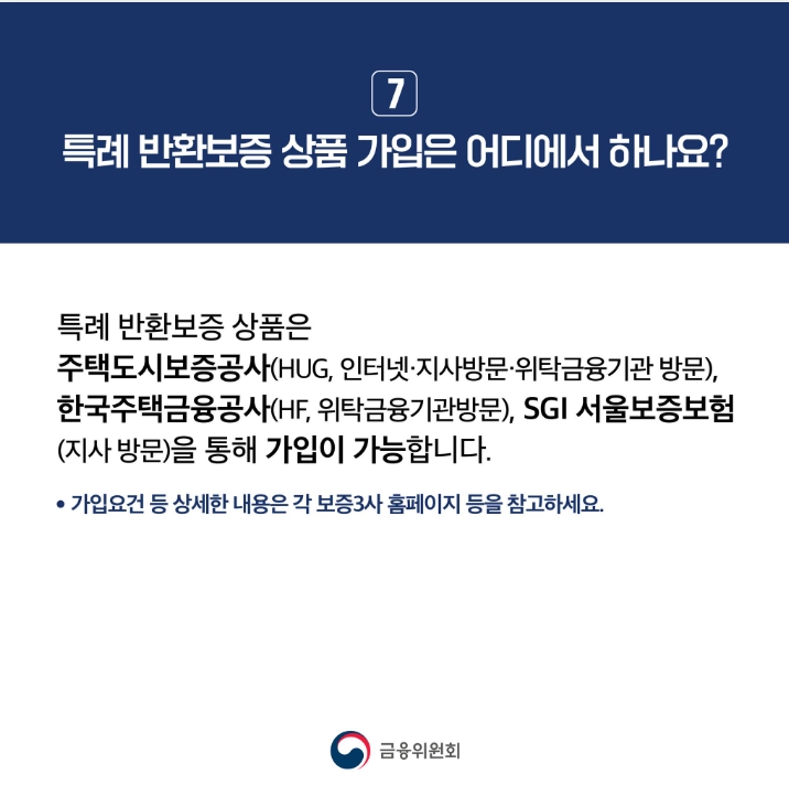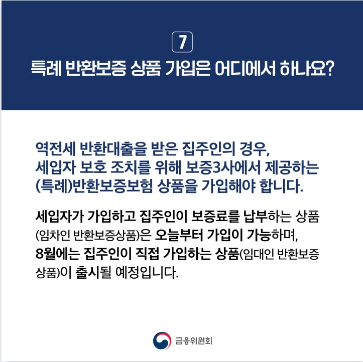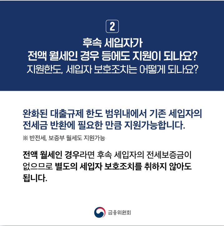 이번 대책은 예상치 못한 전세가격 하락으로 인해 전세금 반환 지연으로 인한 주거이동의 제약이나 전세금 미반환 위험으로 인해 불안해하는 세입자분들이 원활하게 전세보증금을 돌려받을 수 있도록 지원하는 조치입니다. 이를 위해 규제완화 대상이 되는 모든 주택의 후속 세입자가 자신의 전세금을 보호받을 수 있도록 전세보증금 한도가 없고 세입자가 가입하는 상품이 운영됩니다.