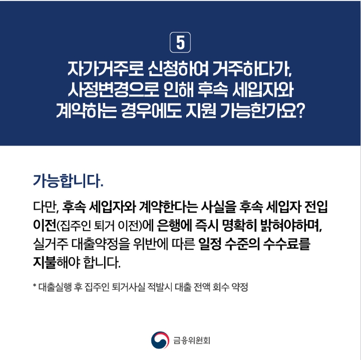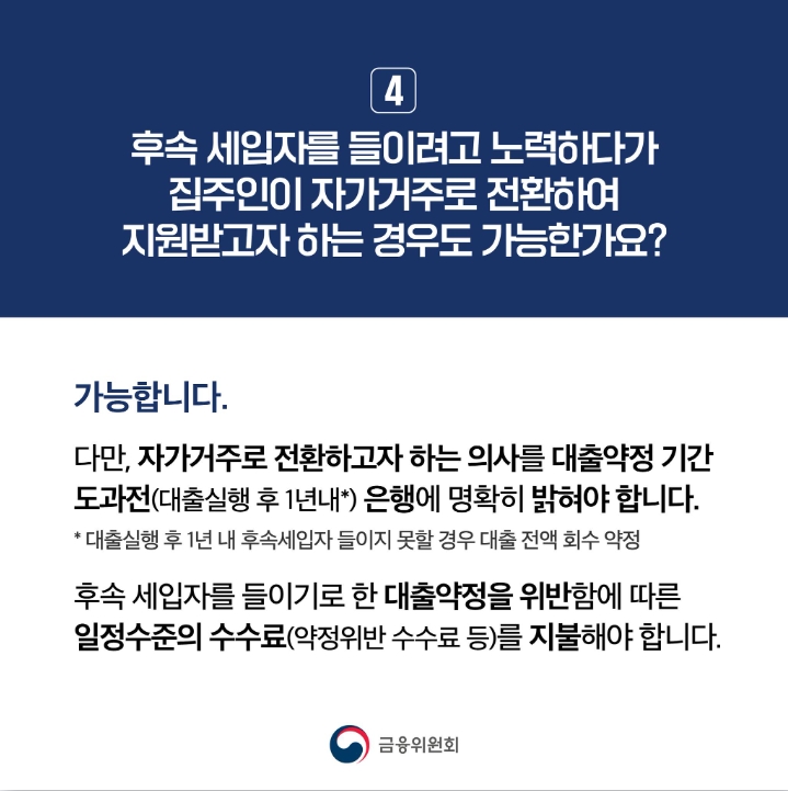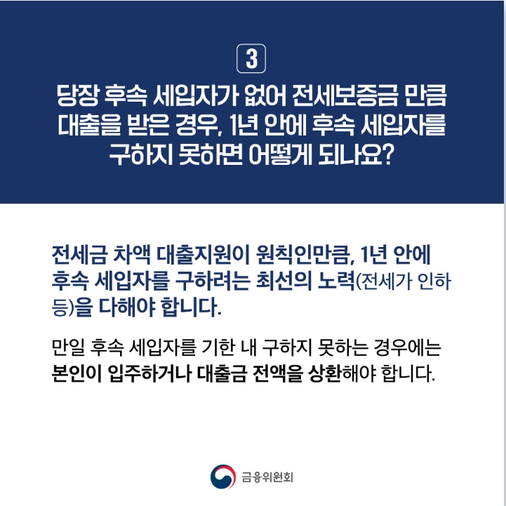 또한, 집주인이 후속 세입자 보호조치를 취하는 것을 전제로 대출규제 완화혜택을 지원할 예정입니다. 후속 세입자가 당장 구해지지 않아도 전세금이 기존 세입자에게 원활히 반환될 수 있도록 완화된 대출규제 범위 내에서 반환자금을 지원하되, 1년 이내에 후속 세입자를 구해 해당 전세금으로 대출금액을 상환하도록 할 예정입니다. 이에 따라 집주인이 자가 거주하거나 후속 세입자를 구하지 못한 경우에도 전세금이 원활하게 반환될 수 있습니다.