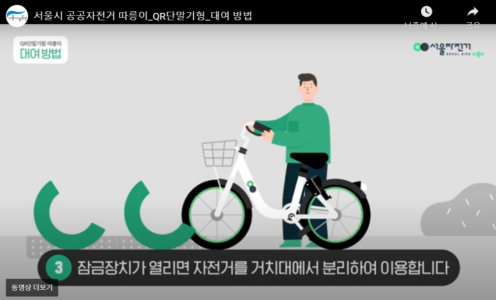 - 잠금장치 해제: 키오스크에서 안내하는 대로 자전거의 잠금장치를 해제합니다.