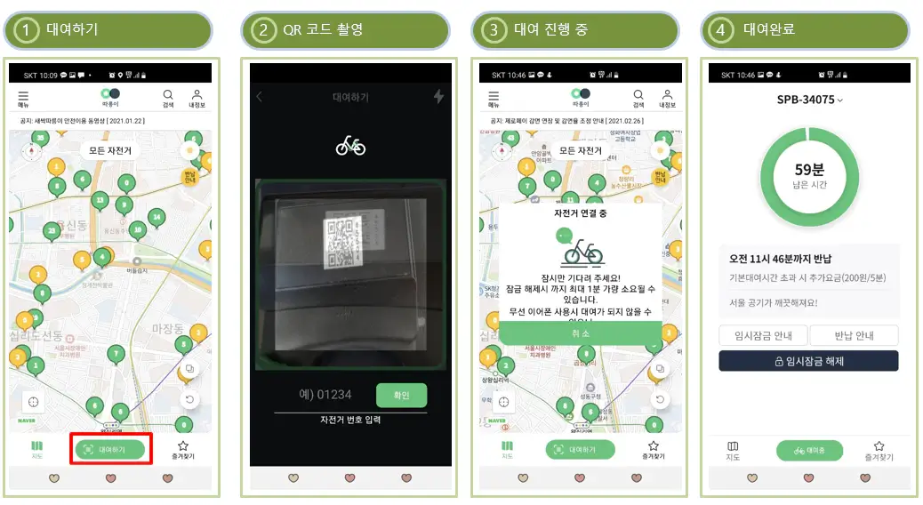 - 대여하기: 앱에서 '대여하기' 버튼을 누르고 자전거 번호를 입력합니다.