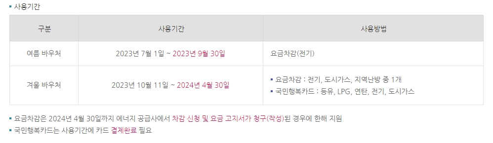에너지바우처는 여름과 겨울에 지원금액이 각각 다릅니다. 여름에는 전기요금을 고지서에서 차감하는 방식으로, 겨울에는 요금 차가 또는 국민행복카드를 발급받아 필요한 에너지를 구입하는 방식으로 지원됩니다.