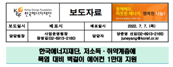 한국에너지재단에서 발표한 보도 자료에 의하면 벽걸이 에어컨 등의 냉방기기 무상 지원 사업을 실시한다고 합니다. 최근 기후 변화로 인하여 폭염이 심하고 이상기후가 빈번하게 발생하면서 사회적 약자의 기후변화에 취약계층이 되었습니다.