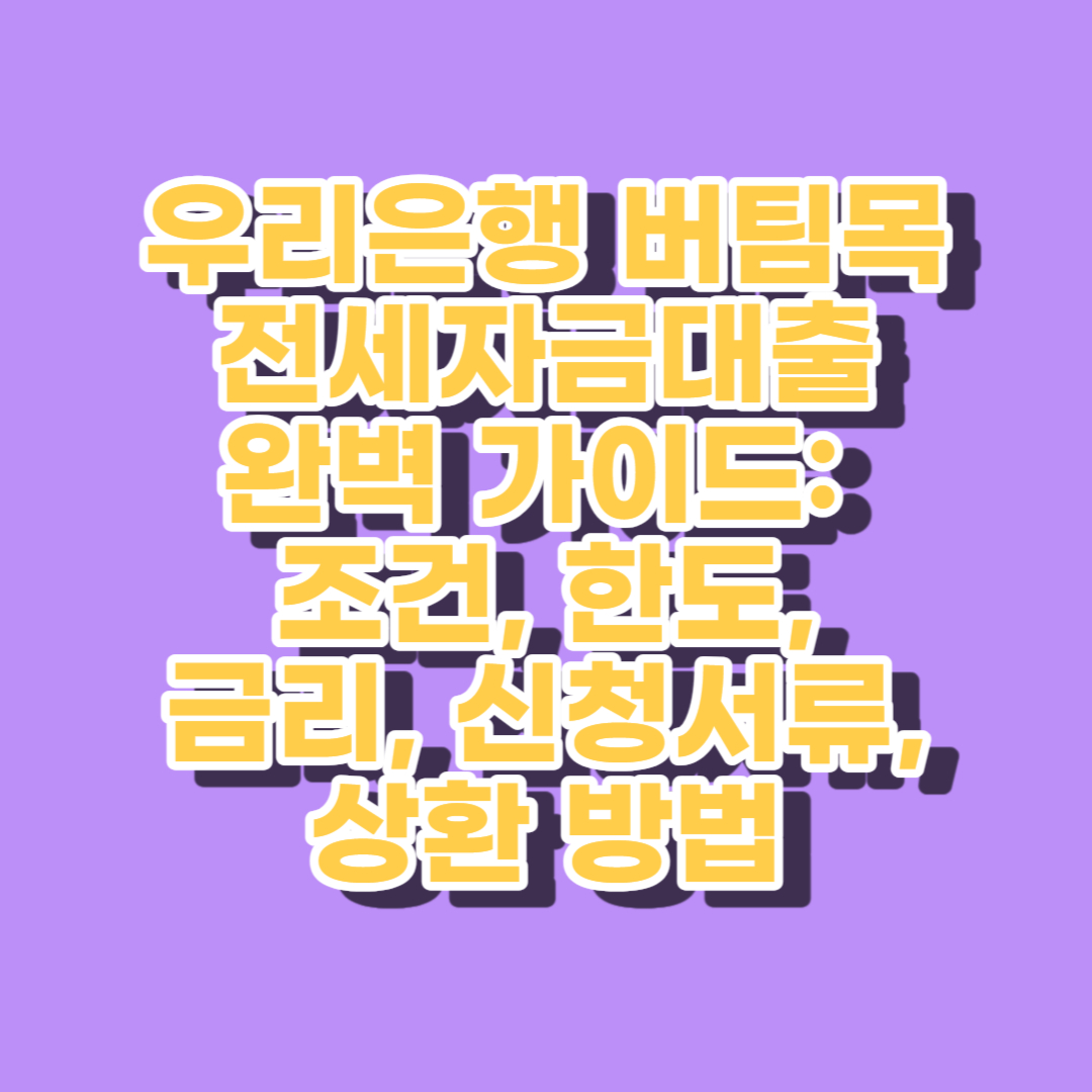 전세금 대출을 고려하고 계시다면, '우리은행 버팀목 전세자금대출'에 대해 알아볼 필요가 있습니다. 이 글에서는 우리은행 버팀목 전세자금대출의 조건, 한도, 금리, 신청서류, 상환 방법에 대한 모든 것을 알려드릴 것입니다. 이 글을 통해 전세자금 대출에 대한 귀중한 정보를 얻고, 더 나은 결정을 내릴 수 있으실 것입니다.