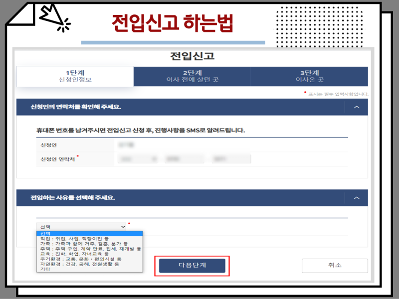 전입신고는 거주지 이동 시 새로운 거주지 관할기관에게 신고하는 절차입니다. 이 민원은 하나의 세대에 속하는 자의 전원 또는 그 일부가 거주지를 이동한 경우에 해당됩니다. 전입신고를 위해서는 주소지변경 및 등록을 위한 신고서를 작성해야 합니다.