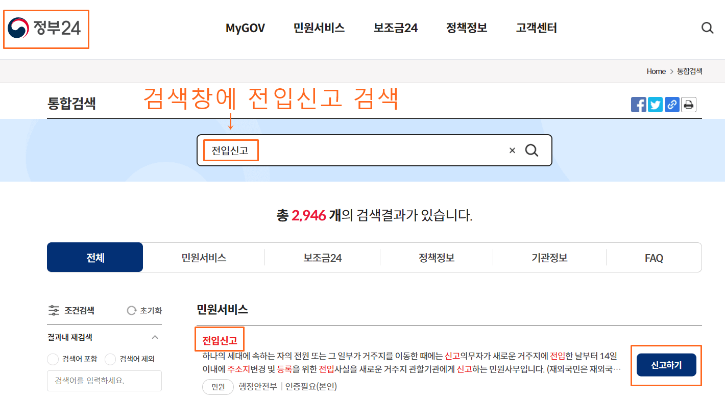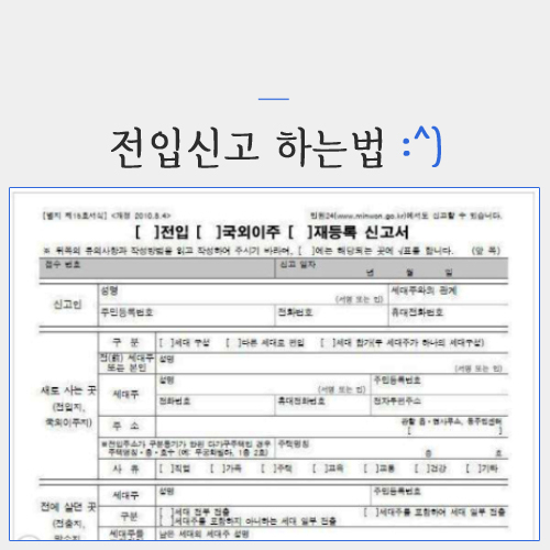 전입신고는 거주지 이동 시 새로운 거주지 관할기관에게 신고하는 절차입니다. 이 민원은 하나의 세대에 속하는 자의 전원 또는 그 일부가 거주지를 이동한 경우에 해당됩니다. 전입신고를 위해서는 주소지변경 및 등록을 위한 신고서를 작성해야 합니다.