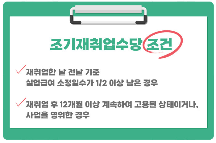 조기재취업수당은 실업급여를 받는 기간이 1/2 이상 남아 있는 경우에 지원됩니다. 즉, 재취업한 날의 전날을 기준으로 소정급여일수를 1/2 이상 남기고 재취업한 경우, 남아있는 실업급여의 1/2을 조기재취업수당으로 받을 수 있습니다. 이를 통해 실업자들이 더 오랜 기간 동안 안정적인 생활을 유지할 수 있도록 도와줍니다. 조기재취업수당은 실업자들의 경제적 부담을 덜어주는 역할을 합니다.