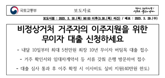 정부에서는 비정상적인 주거환경에 사시는 분에게 10년 무이자 5천만 원 대출을 본격 시행한다고 합니다.