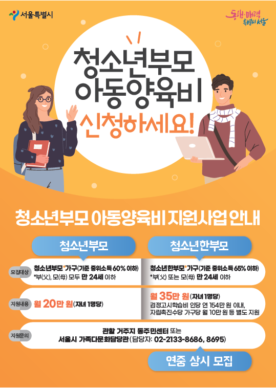 지원내용 : 청소년부모 가구 자녀 1명당 아동양육비 월 20만원씩 지원