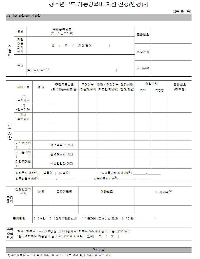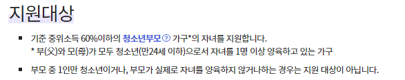 세대별 기준 중위소득 60% 이하 청소년부모 가구의 자녀 둔 가정에서 신청 하실 수 있습니다.